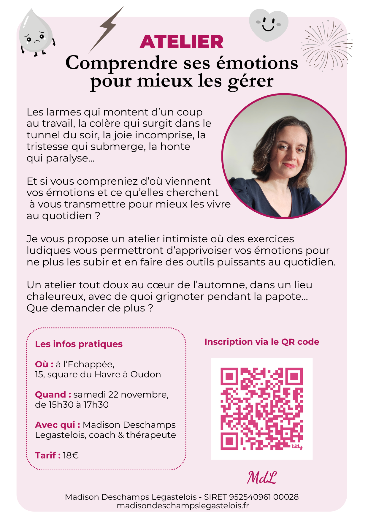 Je vous propose un atelier intimiste où des exercices ludiques vous permettront d’apprivoiser vos émotions pour ne plus les subir et en faire des outils puissants au quotidien.