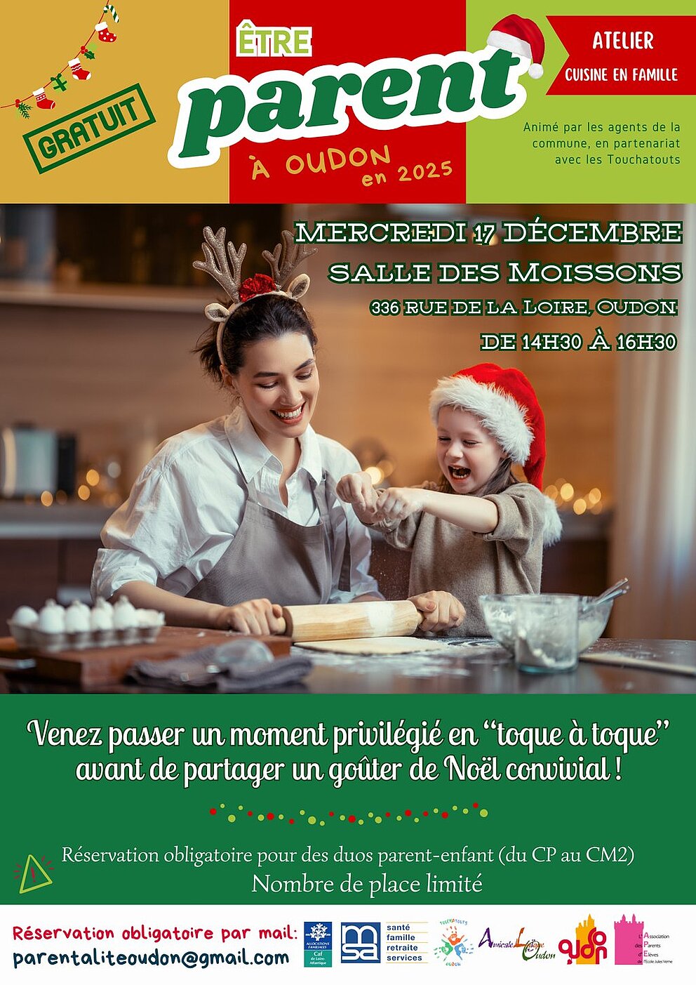 Dans le cadre des actions "être parent à Oudon en 2025", nous vous invitons à venir passer un moment privilégié en "toque à toque" avant de partager un goûter de Noël convivial !