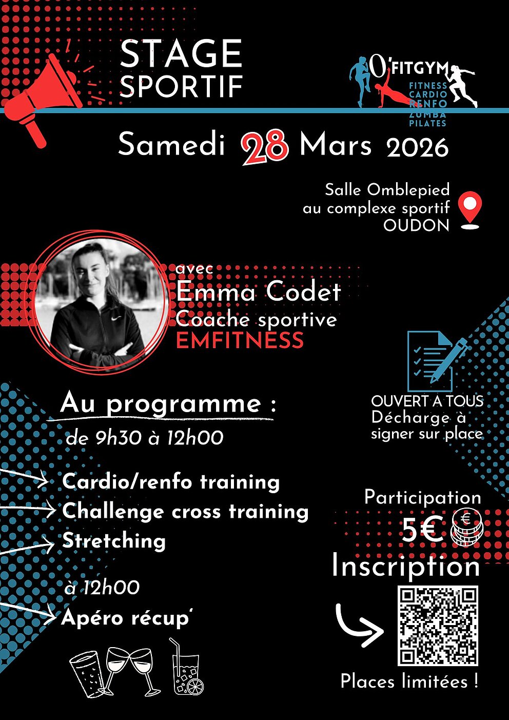 O'Fitgym vous propose de découvrir une nouvelle coache sportive EMMA CODET le temps d'un STAGE SPORTIF le SAMEDI 28 MARS de 9h30 à 12h00, ouvert à tous, dès 16 ans, salle Omblepied à Oudon