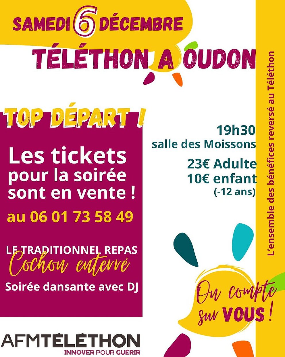 Cette annĂ©e, la 35Ăšme Ă©dition du TĂLĂTHON aura lieu le samedi 6 dĂ©cembre Ă Oudon.